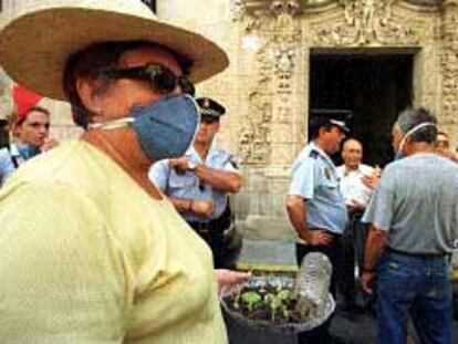 En la fotografía, una mujer con un plato repleto de moscas, que intentó sin éxito entregar al alcalde.