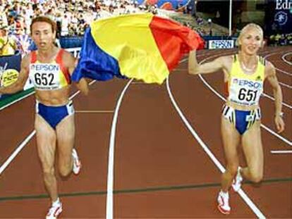 Gabriela Szabo, a la derecha, y Violeta Szekely dan la vuelta de honor al estadio con la bandera rumana tras la final de los 1.500.