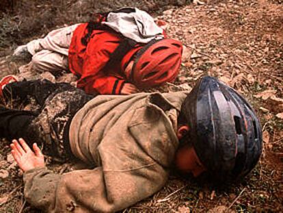 Niños con casco caídos de la bici por accidente, en la cuneta - PLANO GENERAL - ESCENA