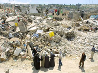 Un grupo de palestinos, ante las ruinas del campo de refugiados de Yenín