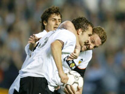 Partido de Liga de Primera División entre el Valencia y el Español: Baraja celebra uno de sus goles al Espanyol junto a Mista y Aimar, en Mestalla. PLANO GENERAL - ESCENA