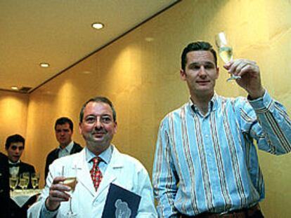 Iñaki Urdangarín brinda, junto con el doctor Manuel García Valdecasas, por su nuevo hijo, Miguel