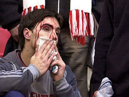 Jornada de Liga, Athletic - Osasuna: un aficionado del Athletic limpiándose la cara ensangrentada. PLANO MEDIO - ESCENA