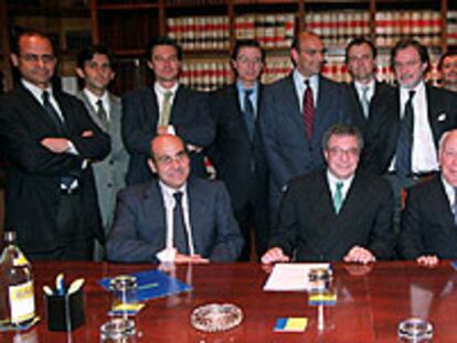 De izquierda a derecha, sentados, Luis Abril, presidente de Vía Digital; César Alierta, de Telefónica; Jesús de Polanco, de PRISA, y Javier Díez de Polanco, consejero delegado de Sogecable. De pie, en el centro, Fernando Abril Martorell y Juan Luis Cebrián, consejeros delegados de Telefónica y PRISA.