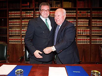 César Alierta, presidente de Telefónica, y Jesús de Polanco, presidente de PRISA, tras firmar el acuerdo de integración de Sogecable y Telefónica
