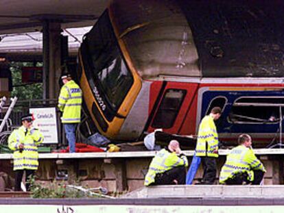 Equipos de rescate y policías, frente al tren accidentado en la estación de Potters Bar, al norte de Londres. PLANO GENERAL - ESCENA