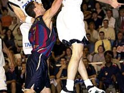 Play offs de la ACD, partido Tau - Barcelona: Tomasevic y Foirest intentan anotar ante de De la Fuente. PLANO GENERAL - ESCENA