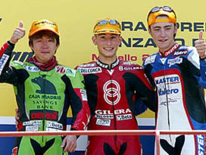 Pablo Nieto, a la derecha de la imagen, saluda desde el podio junto al japonés Ui y a Poggiali en el Gran Premio de Motociclismo de Italia. PLANO MEDIO - ESCENA