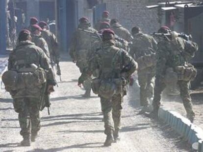Un pelotón de paracaidistas británicos patrulla las calles de Kabul, en Afganistán. PLANO GENERAL - ESCENA