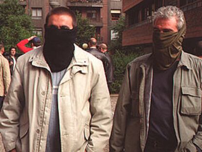 Dos escoltas privados del País Vasco con el rostro cubierto participan en un plante para reivindicar mejoras laborales. PLANO MEDIO - ESCENA