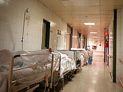 Camas con pacientes en los pasillos del hospital La Paz (Madrid), a la espera de ser atendidos