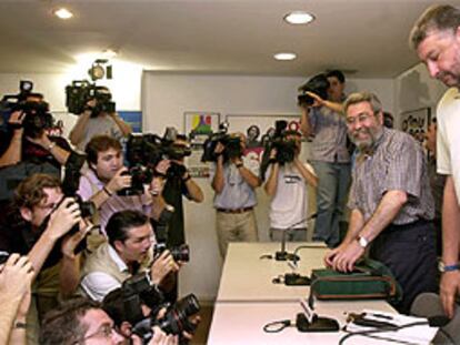 José María Fidalgo y Cándido Méndez, de pie durante una rueda de prensa, frente a numerosos fotógrafos. PLANO GENERAL - ESCENA