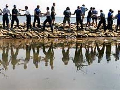 Inundaciones en Centroeuropa: voluntarios construyen un dique con sacos terreros a orillas del río Mulde para proteger la ciudad alemana de Bitterfeld