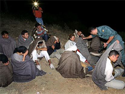 Un guardia civil reparte mantas a un grupo de extranjeros detenidos ayer de madrugada en el Estrecho.
