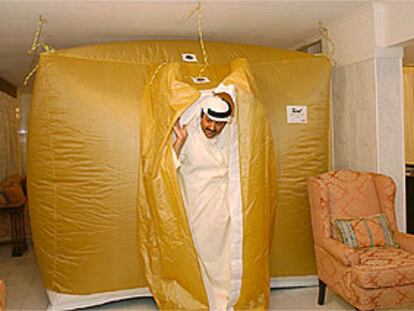 Un ciudadano kuwaití muestra la tienda de campaña instalada en el salón de su casa.