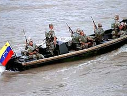 Una patrullera venezolana navega por el río Arauca, frontera entre Colombia y Venezuela.