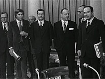 Firma de los Pactos de La Moncloa, en octubre de 1977. De izquierda a derecha: Enrique Tierno Galván, Santiago Carrillo, José María Triginer, Joan Reventós, Felipe González, Juan Ajuriaguerra, Adolfo Suárez, Manuel Fraga, Leopoldo Calvo Sotelo y Miquel Ro