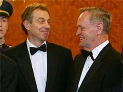 Tony Blair charla con el canadiense Jean Chretien en Praga durante la cumbre de la OTAN