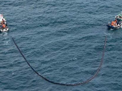 Dos barcos pesqueros intentan recoger el fuel flotante mediante un sistema de redes