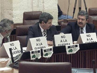 Diputados de IU en el Parlamento andaluz muestran carteles contra la guerra en Irak