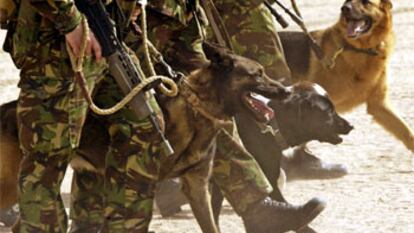 Soldados británicos caminan con perros