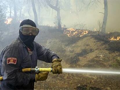 Un bombero trata de extinguir las llamas del incendio declarado esta tarde en Macanet de la Selva