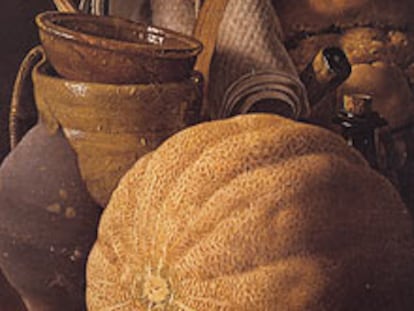'Bodegón con melón cantalupo, uvas, puchero, cesta con pan y objetos de mesa'