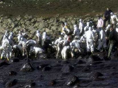 Unos voluntarios limpian el fuel vertido por el 'Prestige'