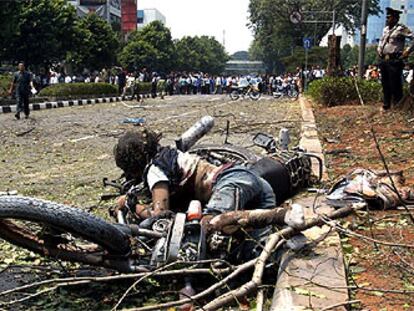 Un cadáver junto a la Embajada de Australia en Yakarta tras el atentado con coche bomba de Al Qaeda