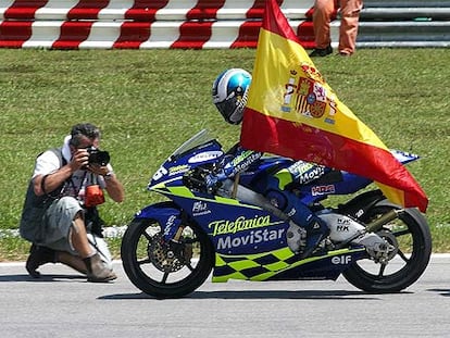 Dani Pedrosa da la vuelta de honor con la bandera española