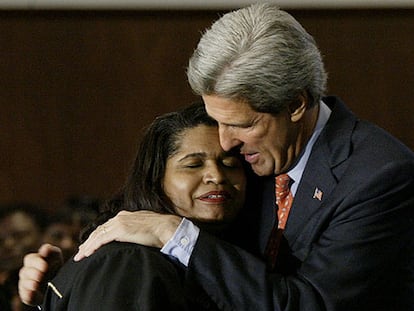 Kerry abraza a una mujer sacerdote