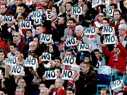 Aficionados rojiblancos muestran una cartulina de rechazo al cambio del Calderón por el estadio de 'La Peineta'