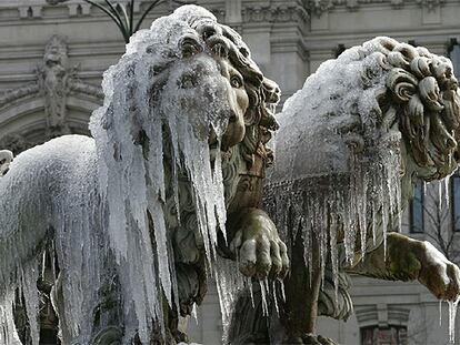 Los leones de la estatua de Cibeles con carámbanos de hielo