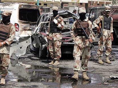 Soldados iraquíes patrullan con el rostro cubierto