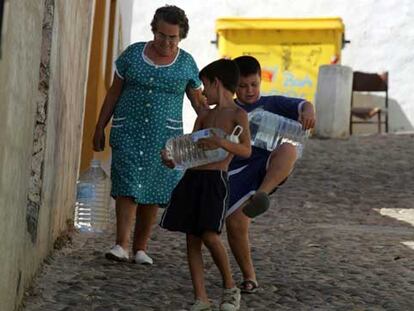 Una vecina y dos niños de Almodóvar del Río cargan botellas de agua mineral