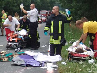 Personal sanitario atiende a las ciclistas australianas arrolladas por un vehículo, accidente en el que falleció la corredora Amy Gillet.