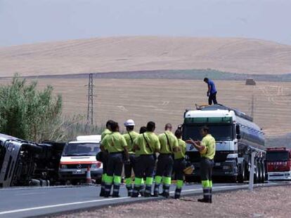Imagen del camión siniestrado en espera de realizar el trasvase de la mercancía