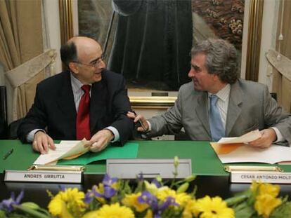 Andrés Urrutia y César Antonio Molina, en la firma del convenio entre el Instituto Cervantes y Euskaltzaindia