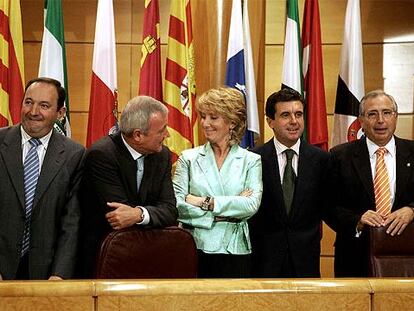 Esperanza Aguirre, flanqueada por Pedro Sanz, Ramón Luis Valcárcel, Jaume Matas y Juan José Imbroda