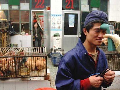 Un técnico toma la temperatura a un empleado en un mercado de aves chino