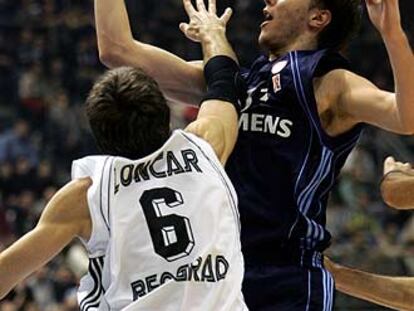 Marko Tomas lanza a canasta ante Nikola Loncar
