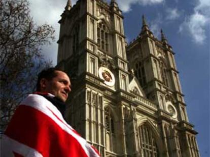 Un ciudadano británico se envuelve en la bandera Union Jack ante la abadía de Westminster