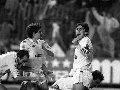 Stielike, Camacho y Santillana celebran uno de los goles al Anderlecht en 1984