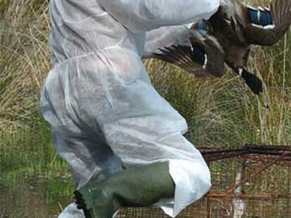 Un técnico del parque de Doñana coge un pato para realizarle análisis