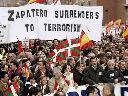 Mariano Rajoy porta la segunda pancarta. Detrás, en inglés, se lee "Zapatero se rinde al terrorismo".