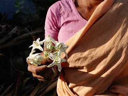 La hindú Rasamma muestra la flor del erukkam y explica cómo su savia aún se utiliza mezclada con leche para matar a las recién nacidas