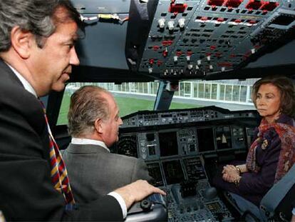 Don Juan Carlos y doña Sofía, en la cabina de un A380 en su visita a la factoría Airbus en Toulouse