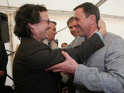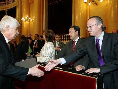 Pasqual Maragall, saluda al líder del PP en Cataluña, Josep Piqué