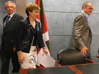 La portavoz del Ejecutivo vasco, Miren Azkarate, entre los consejeros Joseba Azkarraga y Javier Madrazo
