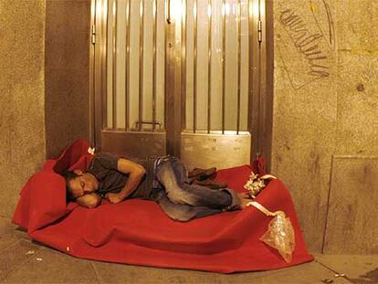 Un hombre duerme sobre una alfombra en la calle del Desengaño